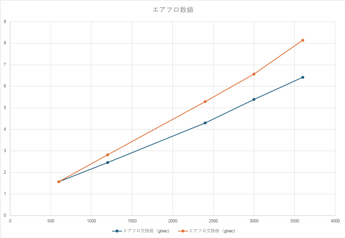 交換前と交換後のエアフロ数値の比較グラフです。両方とも綺麗に比例してエアフロ数値が変化していますが、