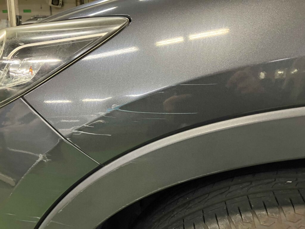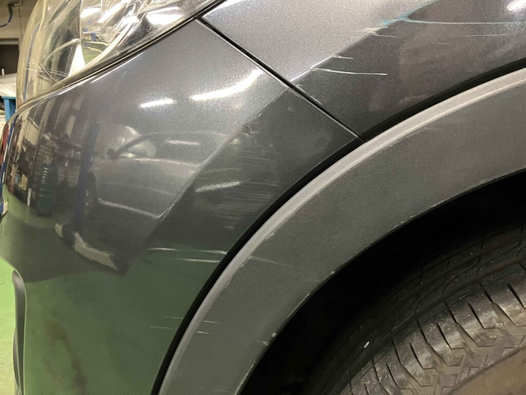 フロントバンパーと左フロントフェンダーに擦り傷と凹みが見受けられました 。特に、左前のバンパーとフェンダーにかけて目立つ傷があり、早めの修理をご希望されていました