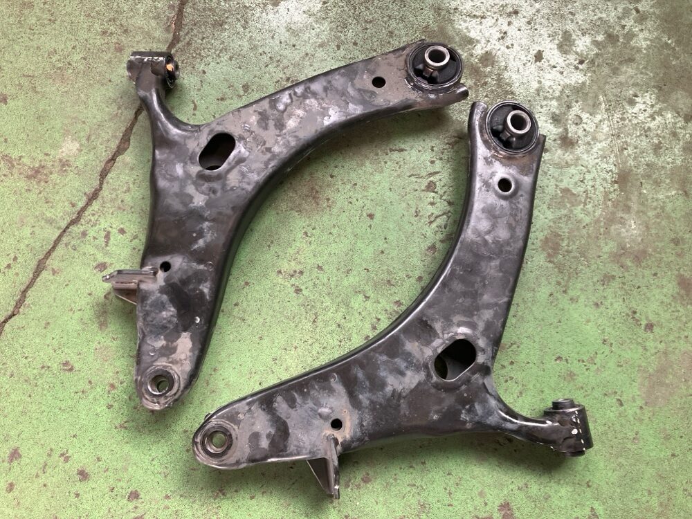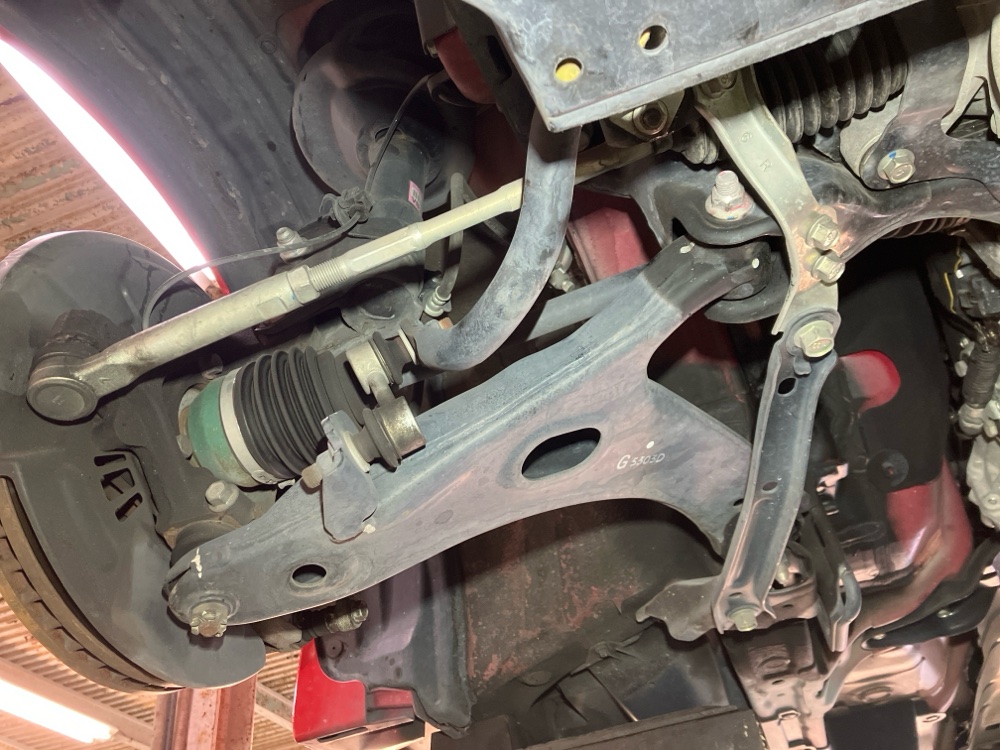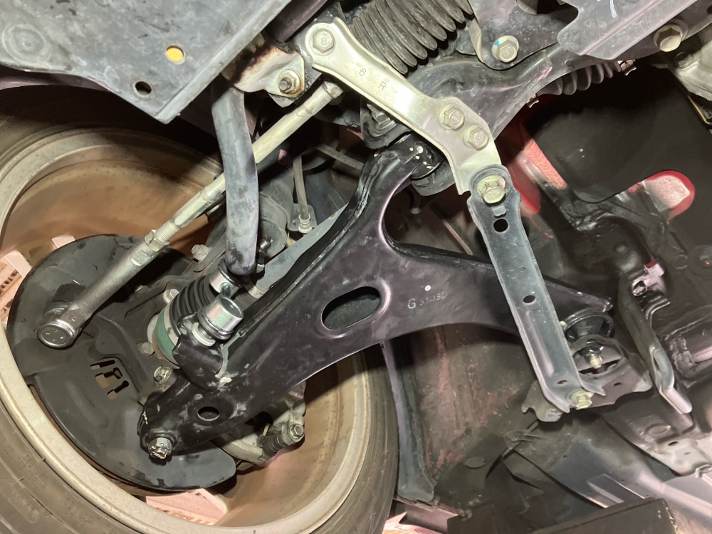 「段差やガタガタ道で前輪下あたりからゴトゴト音がする」とのご相談を受け、リフトアップで点検を行ったところ、左右フロントロアアームの前側ブッシュが断裂しガタつきが確認されました。