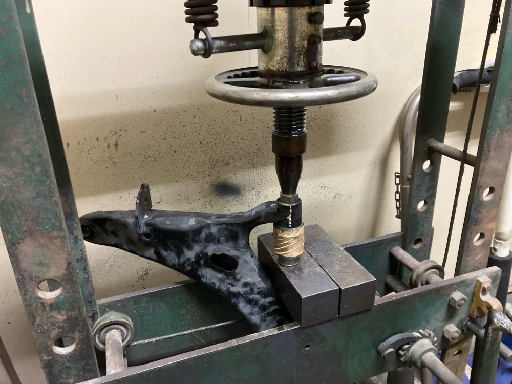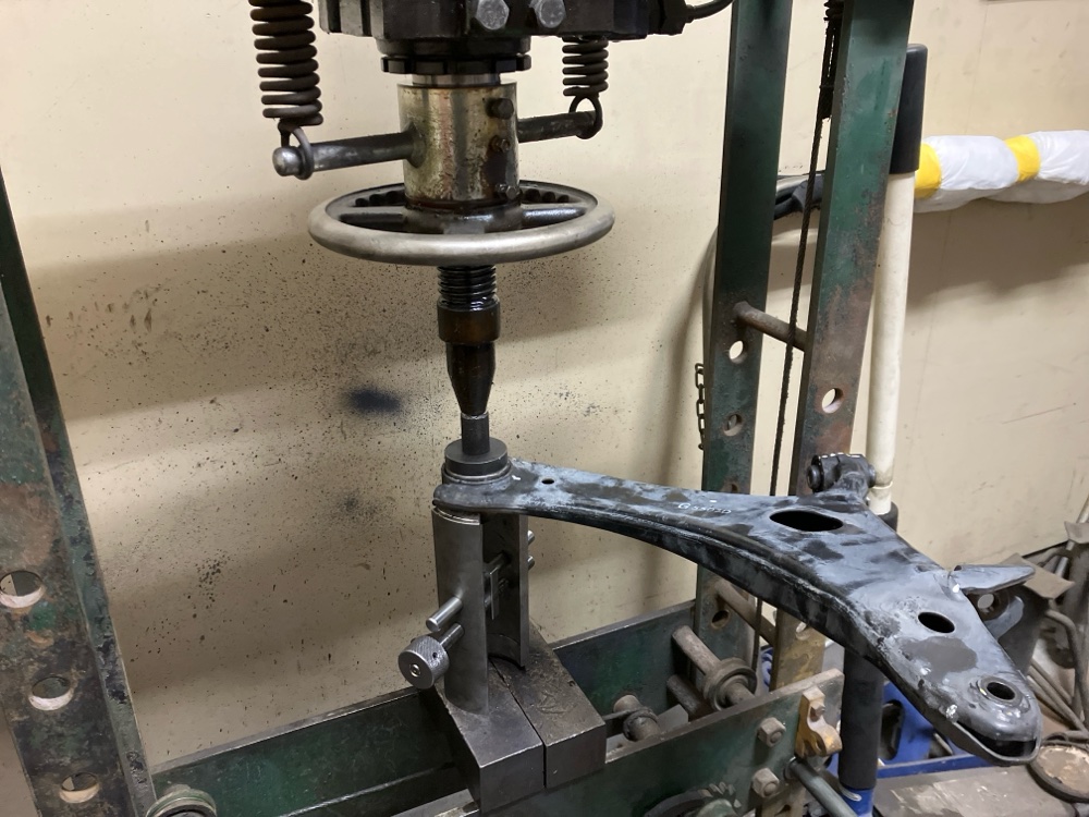 ロアアームを車両から取り外し、専用プレス機を使用してブッシュを新品へ打ち替えしました。