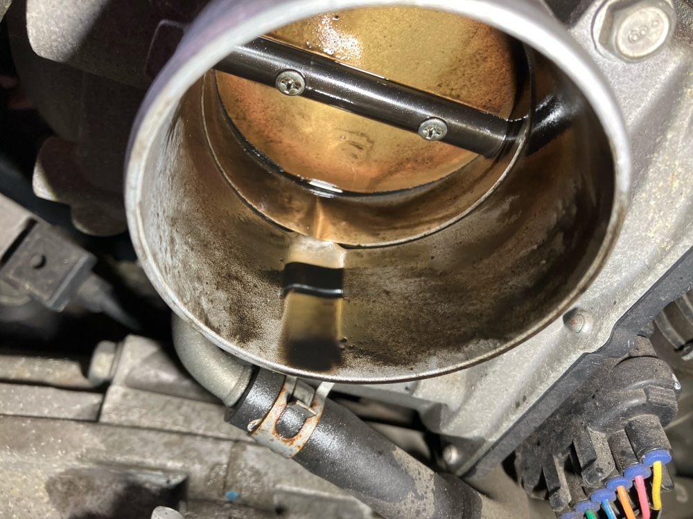 点検を進めた結果、スロットルボディ内部にカーボン(煤)が大量に蓄積していることが判明しました。スロットルボディとは、アクセル操作に応じてエンジンへ送る空気量を調整する重要な部品です。内部が汚れると空気の流れが悪くなり、エンジンの調子が悪化してしまいます。