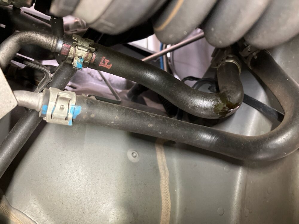 トランスミッション側の点検では、オートマオイルクーラーホースからオイルが漏れている状態を発見しました。オートマオイルはトランスミッションの動作に不可欠な油脂です。漏れを放置すると変速不良やトランスミッション故障につながります。