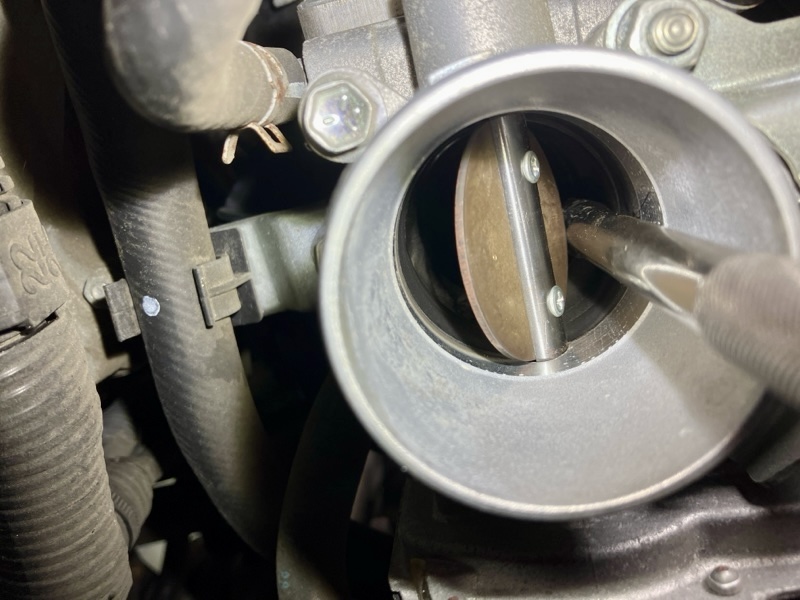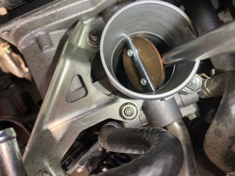 スロットルボディを点検したところ、カーボンの堆積が確認されました。スロットルボディにカーボンが蓄積すると、吸気通路が狭くなり、適正な空気量がエンジンに供給されなくなります。これが空燃比補正率の異常につながっていたと判断し、吸気系の徹底的な清掃を実施することにしました。