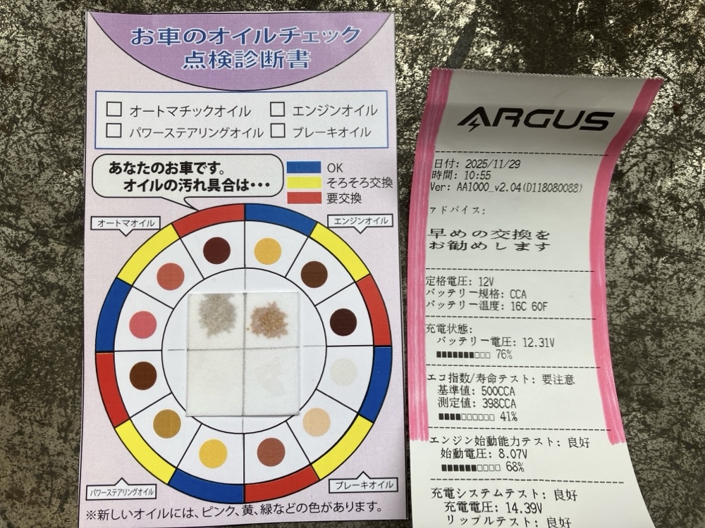 バッテリー交換:バッテリーテストの結果、充電状態76%、寿命テスト41%(基準値500CCA、測定値398CCA)、エンジン始動能力テスト68%(8.07V)という数値でした。寿命テストの値が基準を下回っており、交換時期と判断しました。GSユアサ ER 75B24L/N-75を装着しています。