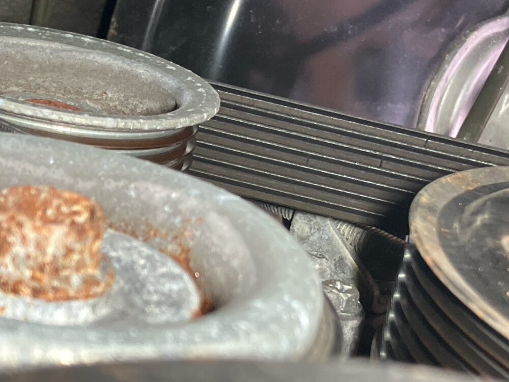 Vベルト全数取替:ファンベルト(7PK988L)とクーラーベルト(SF4PK718B)を新品に交換しました。ベルトの劣化は突然の破損につながるため、予防的な交換を推奨しています。
