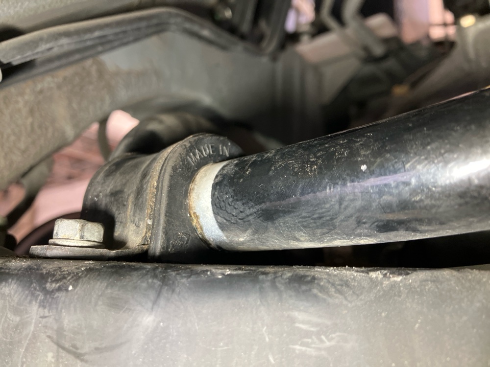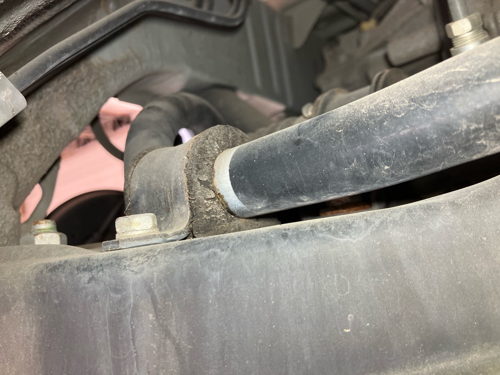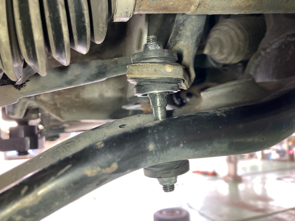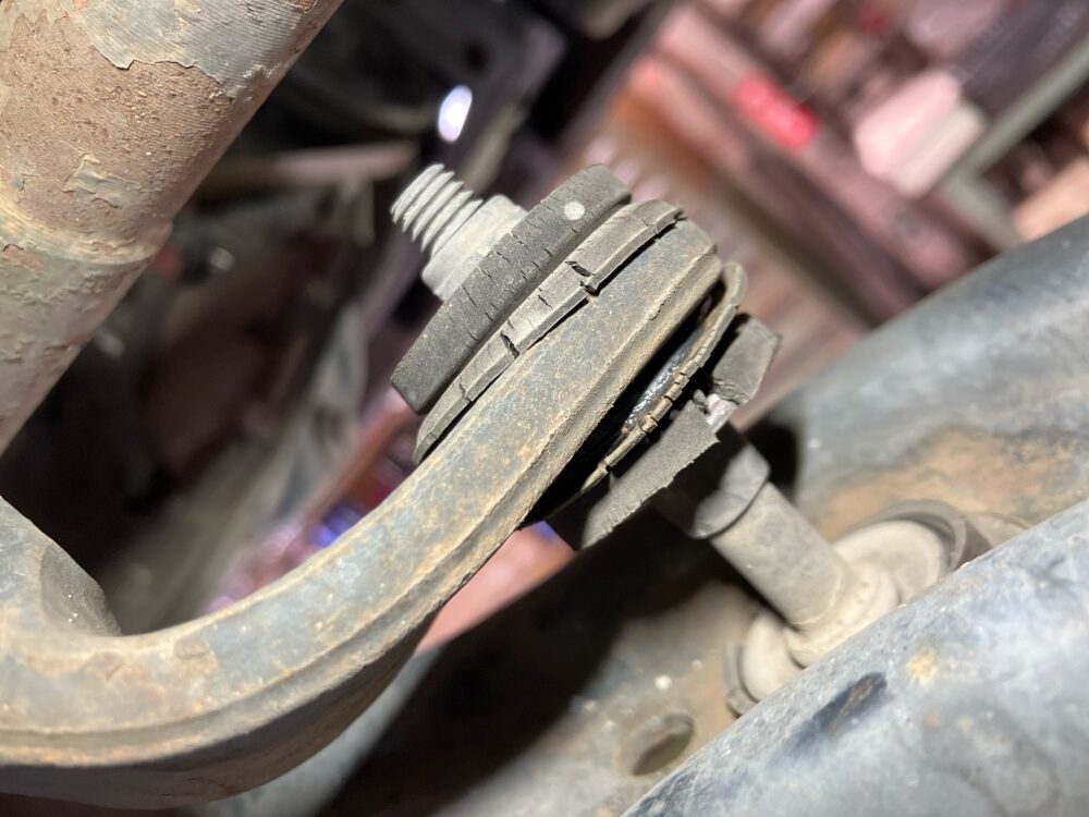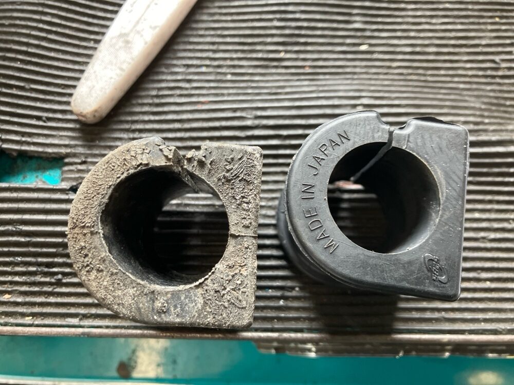 足回りを点検すると、スタビライザーブッシュに亀裂と変形があり、段差での異音の原因になっていました。