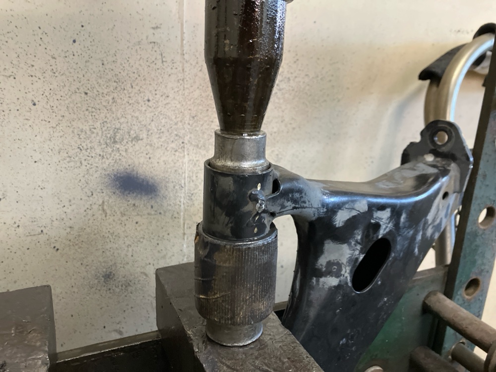 ロアアームブッシュをプレスで打ち換えている作業状態の画像です。