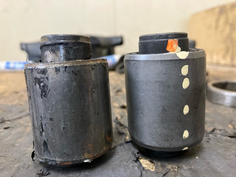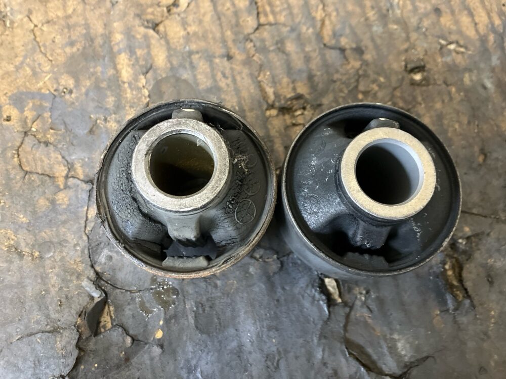 前輪ロアアームの前側ブッシュです。左側の抜き取ったブッシュはゴムが断裂しており、内側の筒部分が動いてしまう状態でした。