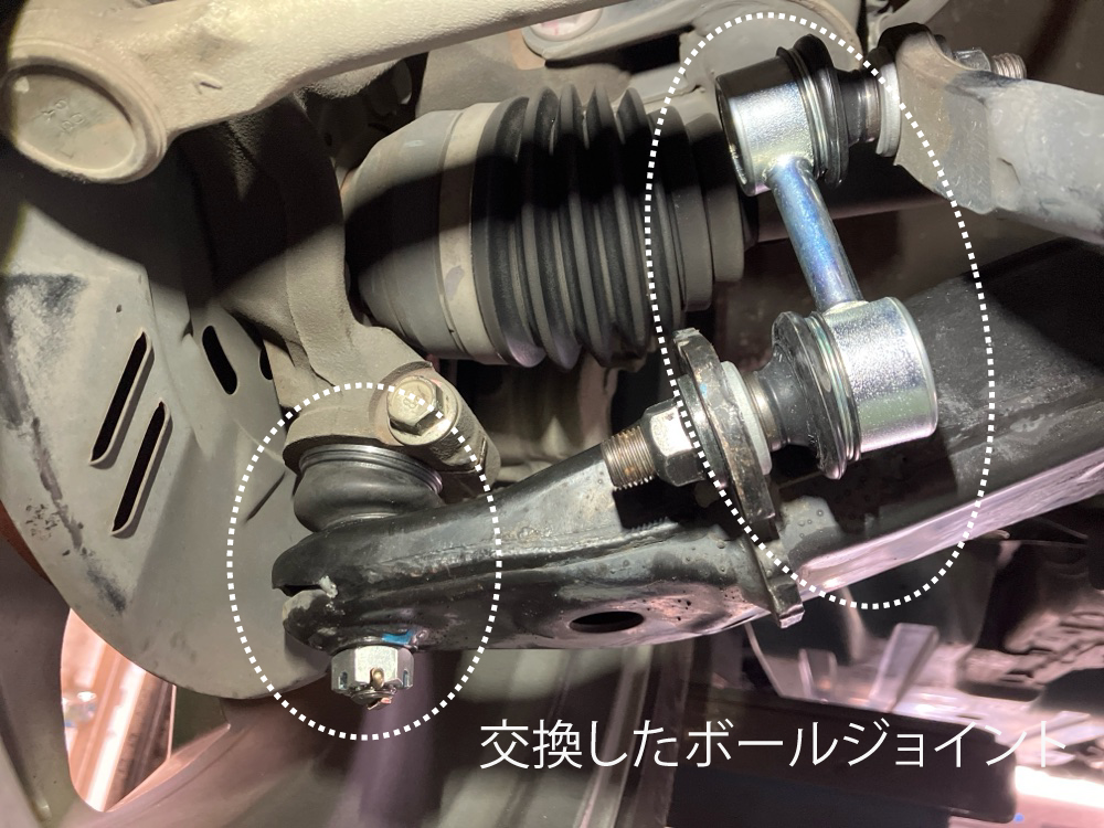 交換後のスタビライザーリンク、ロアアームボールジョイントの装着状態の画像です。