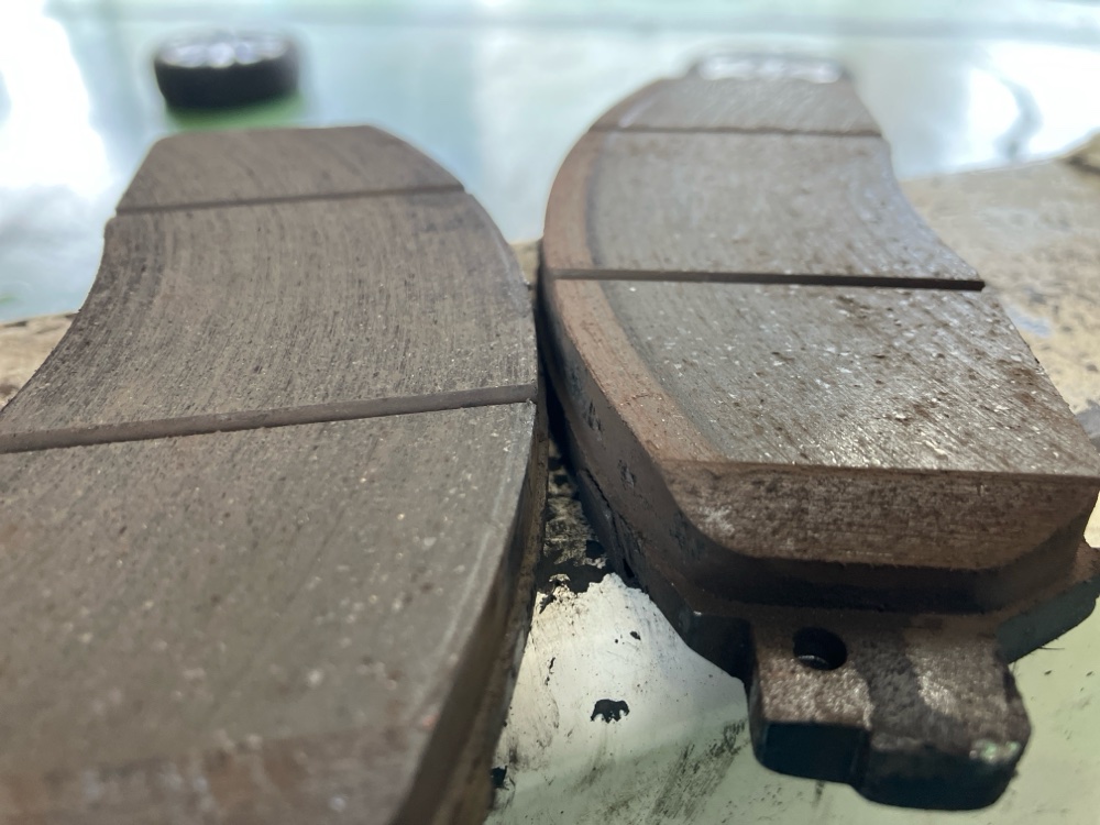 ローターの偏摩耗に合わせて、パッド表面にも筋状の摩耗が発生しています。この状態では新品パッドに交換しても、ローター側の問題が残るため根本的な解決にはなりません。