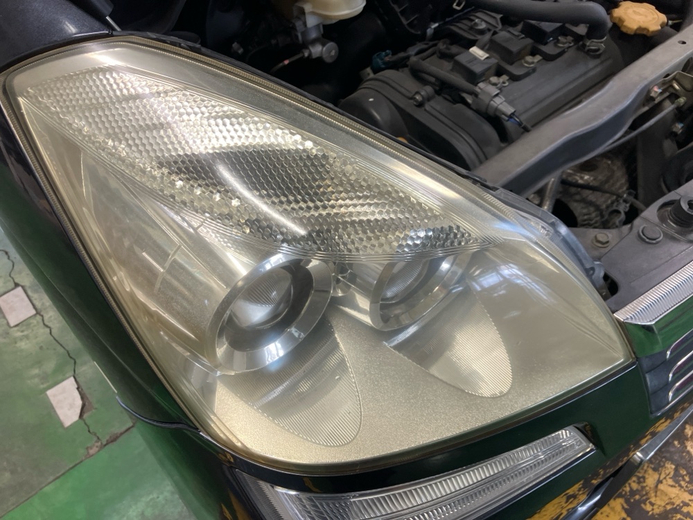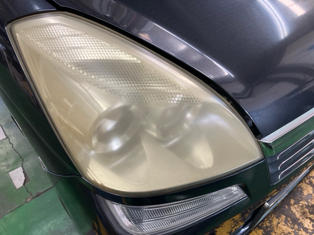 平成18年式という車齢から、ヘッドライトのポリカーボネート製レンズが紫外線や熱により劣化し、表面が白濁・黄ばみを起こしていました。この状態では光が正常に透過せず、夜間走行時の視認性低下だけでなく、車検の保安基準もクリアできません。