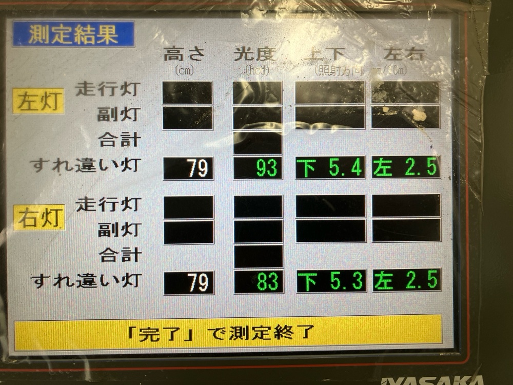 ▲ 施工後の光度測定結果。保安基準を大きく上回る数値となり、車検適合となりました。