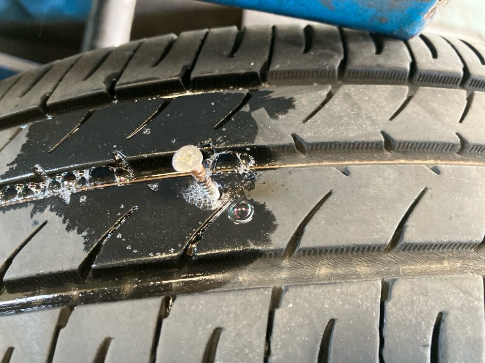 ▲ リヤタイヤに刺さっていたビス。トレッド面中央部への刺さり方のため、外面修理で対応可能と判断しました。