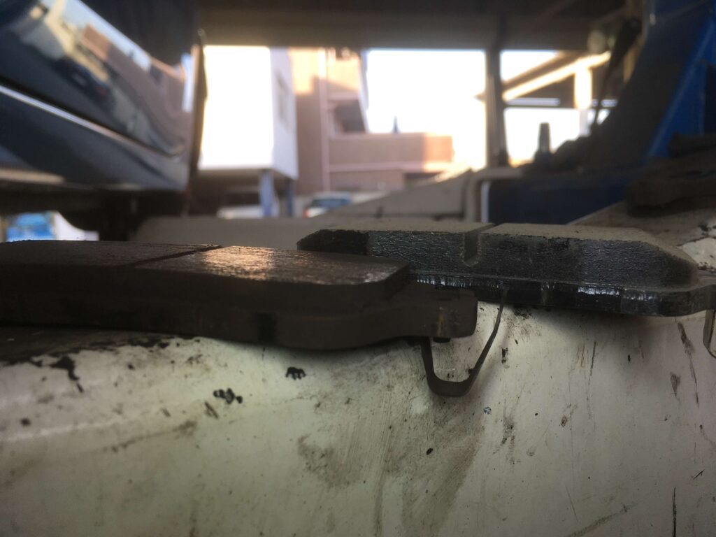 交換したブレーキパットです。装着品3.8mm、新品は10.0mm。前回点検時の残量から鑑みて、交換させて頂きました。