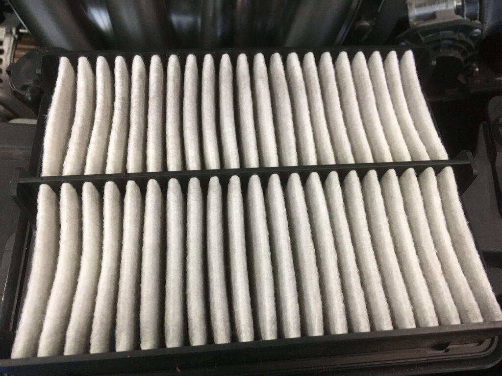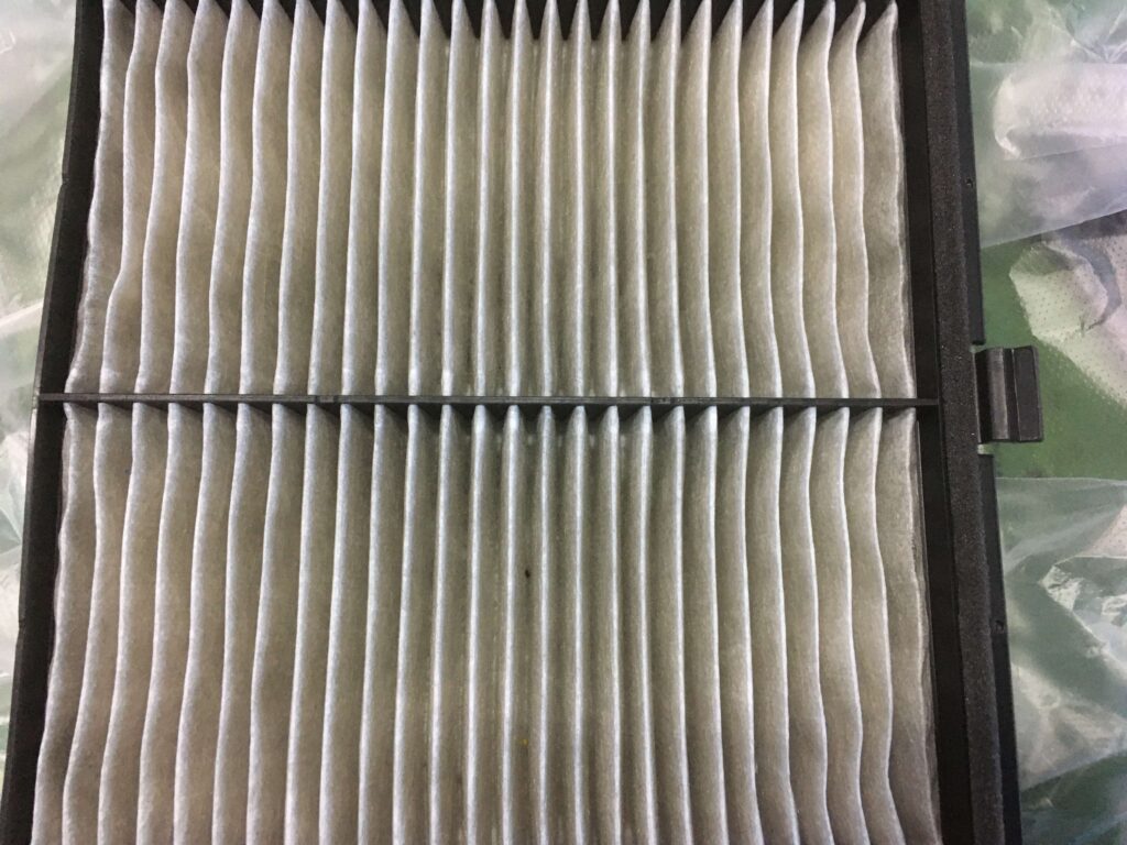 エアコンフィルターです。新品は真っ白ですが、大分ダストによる汚れが見られた為、交換させて頂きました。