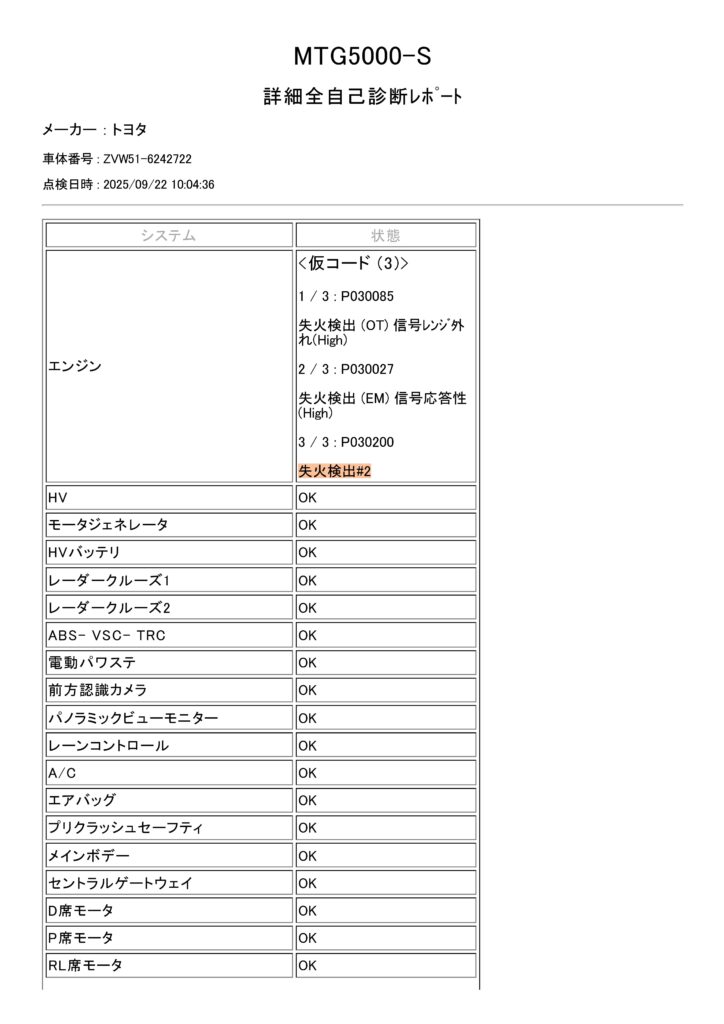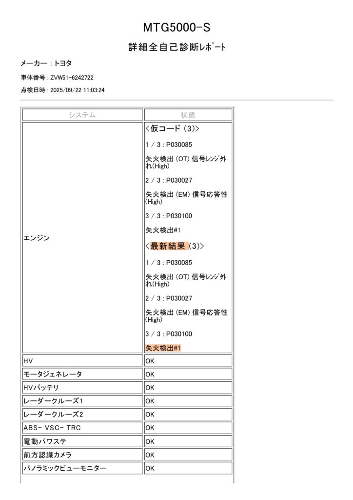 しかし、すぐに再び警告灯が点灯したとのご連絡をいただき、再度ご来店いただきました。スキャンツールで確認すると、今度は1番シリンダー失火のコードが残っていました。