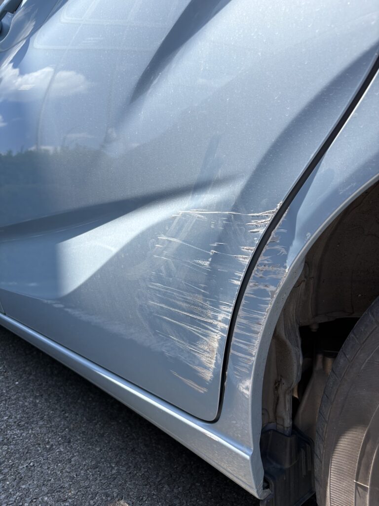 「左側面が凹んでしまった」「スライドドアとその後ろのパネルに傷と歪みがある」といったご相談は、日野市・八王子市・多摩市エリアでも非常に多くいただきます。今回は、ホンダ フリード+(6BA-GB5)にお乗りの栗原様より、左スライドドアおよび左クォーターパネル(左リヤアウトサイドパネル)の凹み修理のご依頼をいただきました。