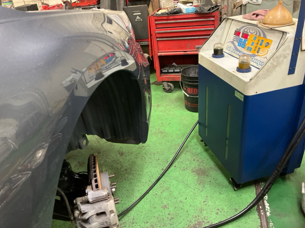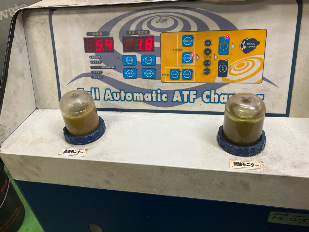 通常の抜き替えでは全量交換が難しいCVTフルードですが、今回は専用機器「トルコン太郎」を使用し、圧送方式で内部をしっかり洗浄・交換しました。