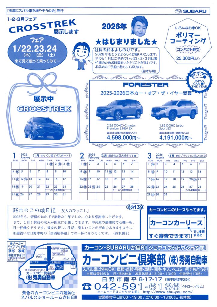 このたび、スバル車の展示会を下記の通り開催いたします。今回は実際に走りを体感していただけるよう、新型フォレスターの試乗車をご用意しております。実際の乗り心地や安全装備などをぜひ体感してください。(チラシはクロストレックとなっておりますが、急遽変更となりました。どうぞよろしくお願い致します。)